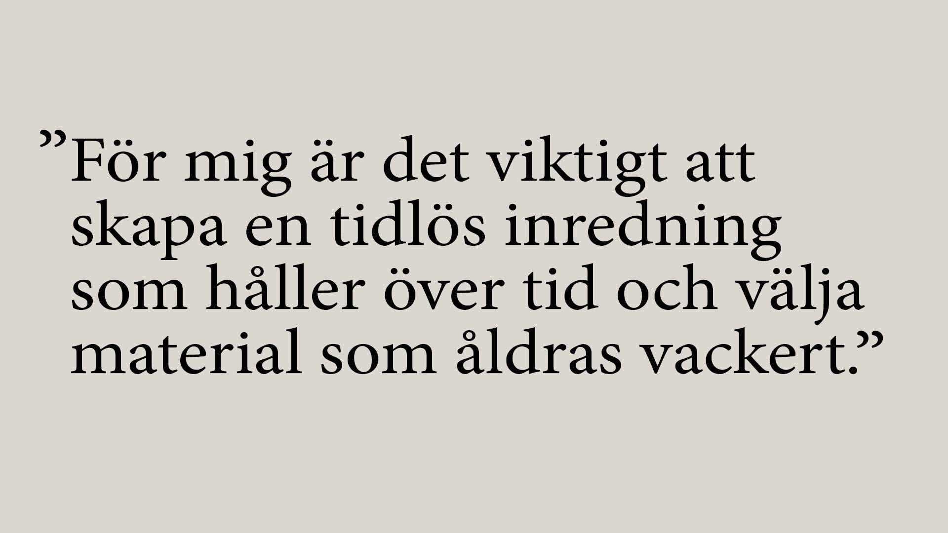 För mig är det viktigt att skapa en tidlös inredning som håller över tid och välja material som åldras vackert. Det handlar om att inte falla för de senaste trenderna, utan välja en bas som man känner att man kan leva med länge. Att inreda hållbart är genomgående en viktig aspekt i alla projekt vi arbetar med.