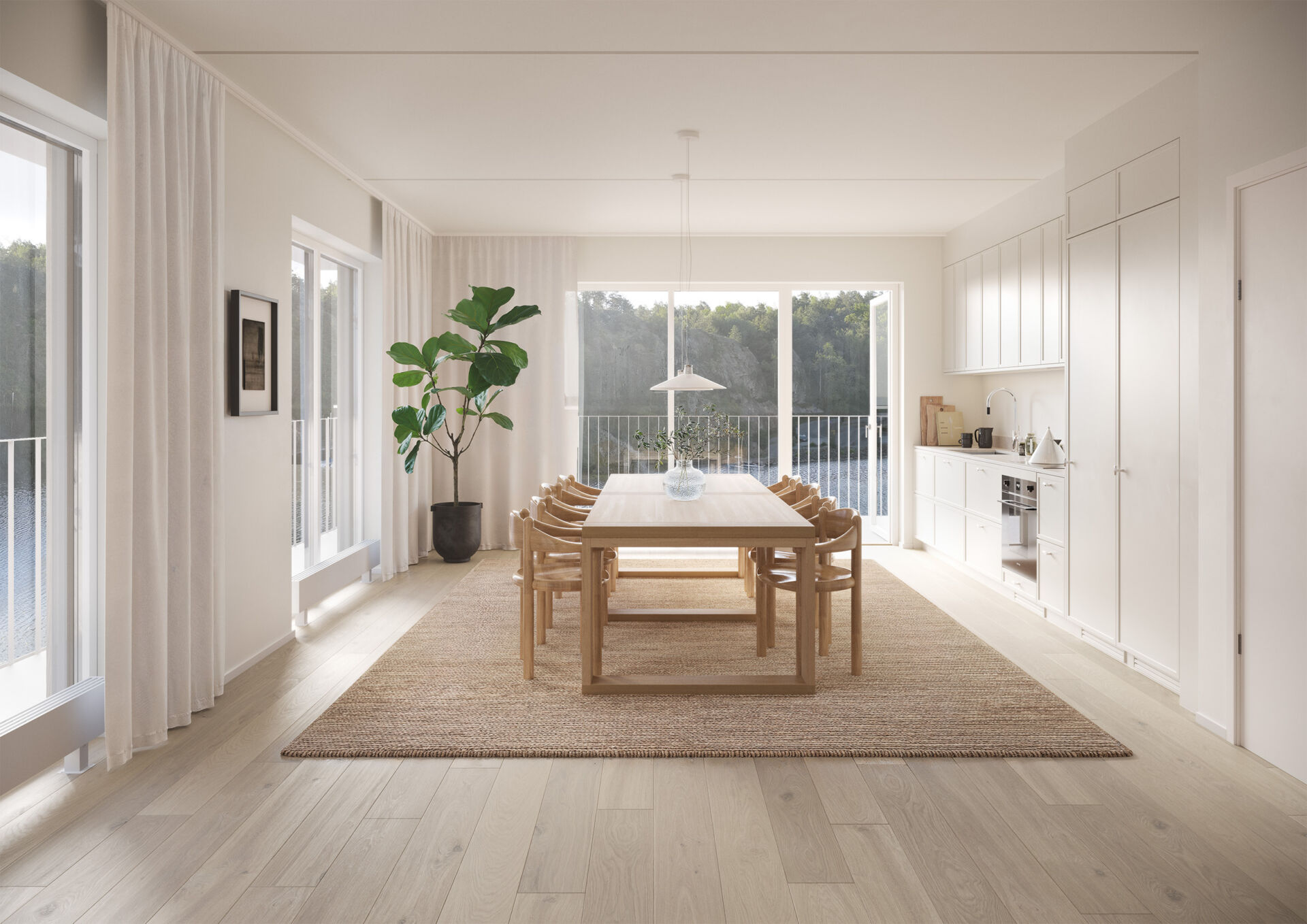 I alla våningar finns genomgående varma färger ton i ton och hållbara tidlösa kvalitetsmaterial. Ljusa ekgolv och noggrant utvalda inredningsdetaljer binder samman inte bara rummen, utan även interiören med naturen utanför. Fönster från golv till tak öppnar upp och gör utsikten till en del av hemmet, var du än befinner dig. I de större fyrarumslägenheterna finns ett rymligt master bedroom med privat badrum och walk-in closet.