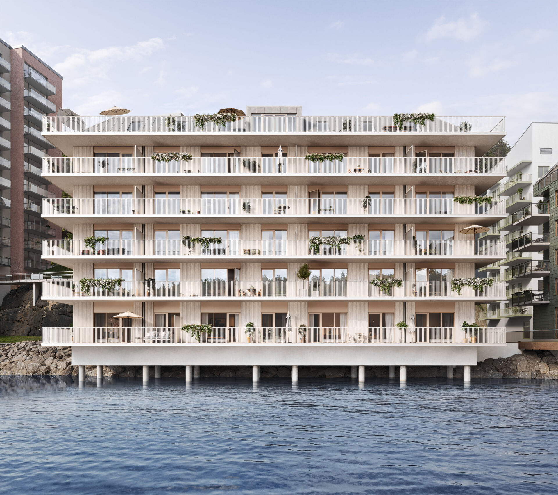 Det är inte ofta man får chansen att rita ett hus med ett så spännande läge. Att byggnaden bokstavligen ligger på vattnet gjorde att vi ville skapa en arkitektur som handlar om öppenhet. De svepande balkonglinjerna som löper runt hela huset och de fullhöga fönsterpartierna ger en ständig kontakt med havet och utsikten, hur man än rör sig genom rummen.